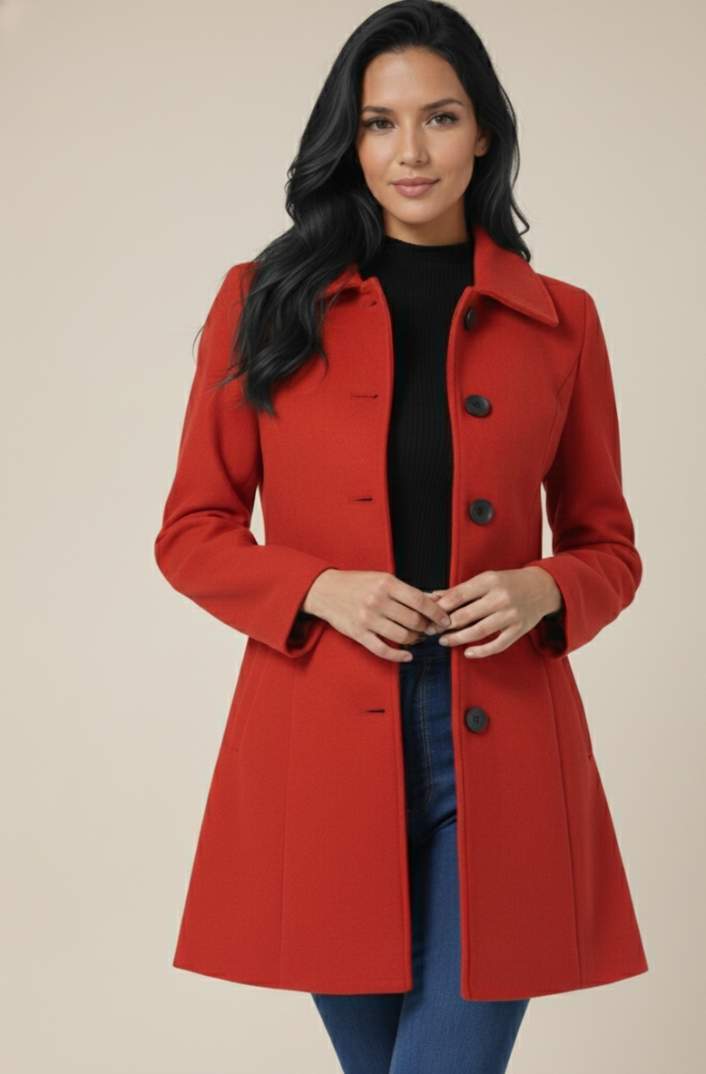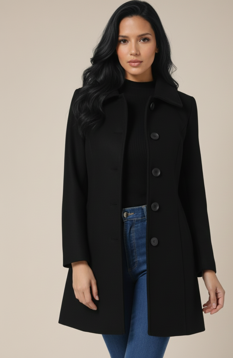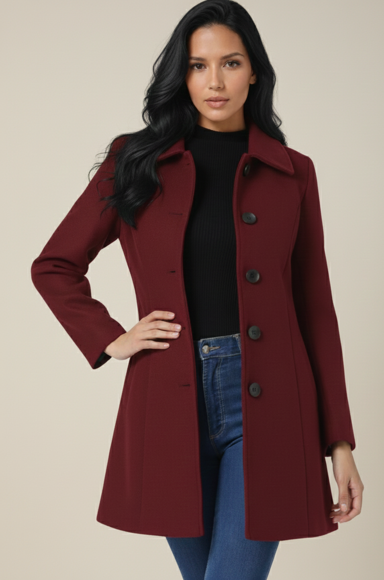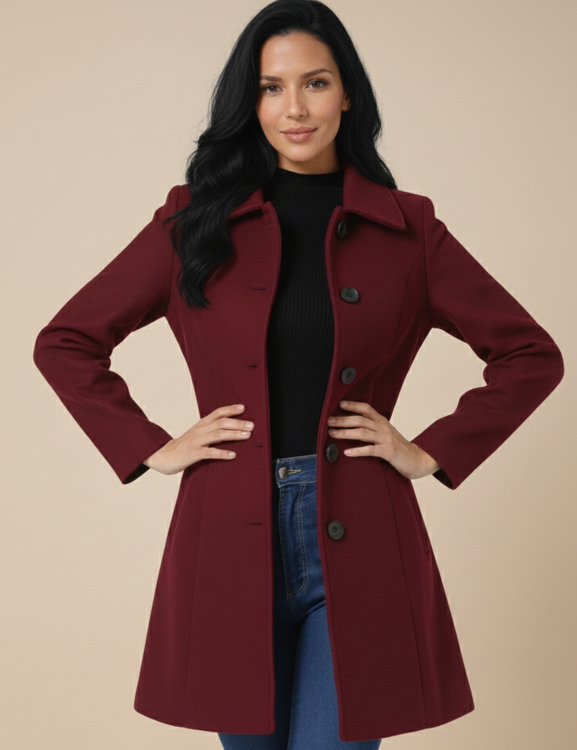 De Aurora Getailleerde Damesjas biedt een elegant silhouet dankzij de smalle taille en subtiel uitlopende zoom. De klassieke kraag en verfijnde lijnen zorgen voor een tijdloze uitstraling die geschikt is voor dagelijks gebruik en half-formele gelegenheden. De jas laat zich moeiteloos combineren met een smalle broek of een stijlvolle midi-rok.