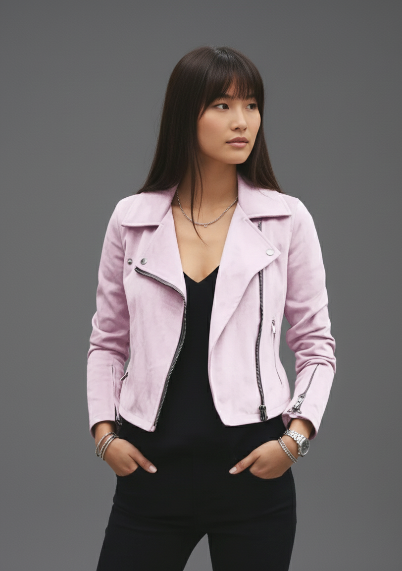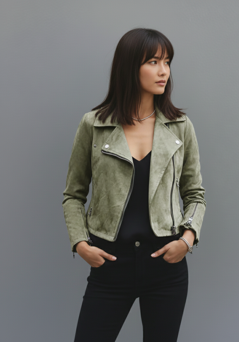 De Livia Jas tilt biker-chic naar een hoger niveau. Met haar klassieke biker-snit, zilveren ritsen en trendy suede-look in kaki geeft ze elke outfit direct een moderne en stijlvolle uitstraling.