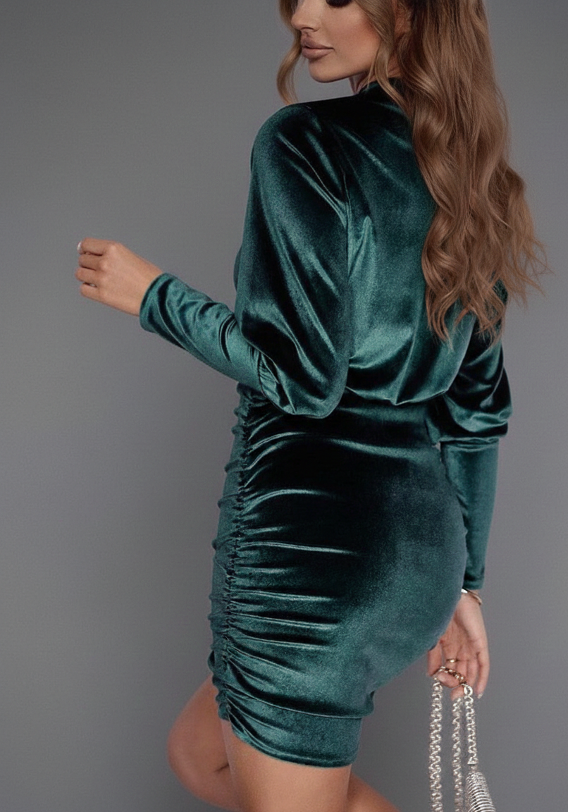 Maak een onvergetelijke indruk met de Smaragdglans fluwelen mini jurk voor dames. Deze elegante avondjurk is ontworpen om het figuur mooi te accentueren dankzij het getailleerde model en de geplooide rok. De lange mouwen en gepofte schouders geven de jurk een verfijnde uitstraling, terwijl de zachte fluwelen stof zorgt voor een luxe en feestelijk gevoel.