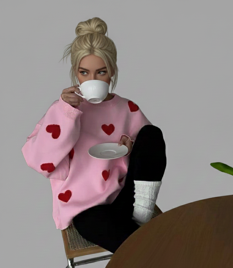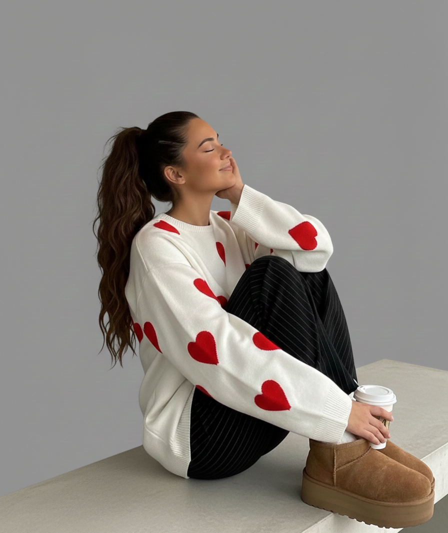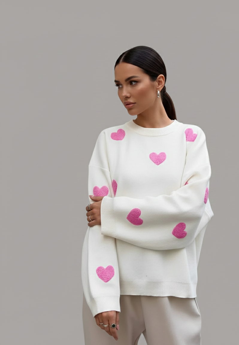 Het speelse hartjesdessin geeft de trui een modieus accent, terwijl het comfortabele materiaal zorgt voor een prettig draaggevoel gedurende de hele dag. Ideaal voor dagelijks gebruik, een casual dag buitenshuis of een ontspannen moment thuis.